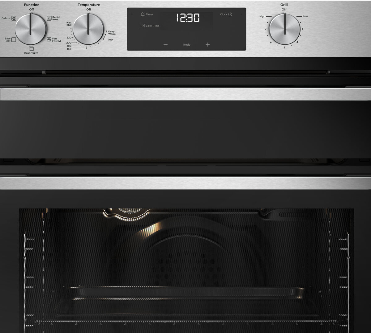 60cm multi-function 5 stainless steel underbench oven with separate grill, fast heat up, programmable timer, and 80L gross capacity.